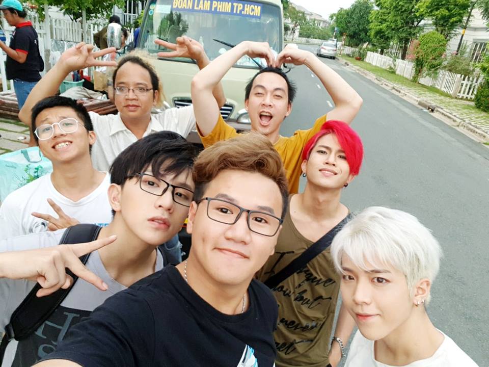 Hình ảnh được đạo diễn Minh Móm (đeo kính, ở giữa) đăng tải trên trang cá nhân với 3 thành viên nhóm C&C trong phim Thần tượng tuổi 300: Trần Phong, Anh Tú và Tâm Đức.