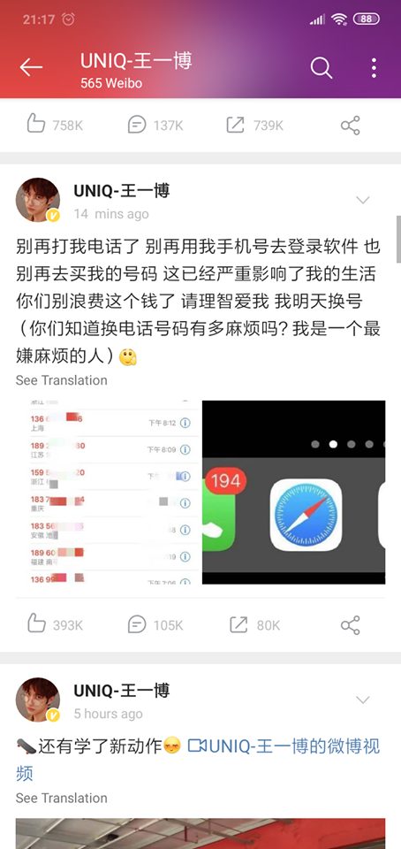 Vương Nhất Bác đã phải update weibo về việc này: “Đừng gọi điện thoại cho tôi nữa, đừng dùng số điện thoại của tôi đi đăng nhập các ứng dụng, cũng đừng đi mua số điện thoại của tôi nữa. Việc này đã ảnh hưởng nghiêm trọng đến cuộc sống của tôi. Các bạn đừng lãng phí tiền nữa. Hãy yêu thương tôi một cách lí trí. Ngày mai tôi sẽ đổi số điện thoại. (Các bạn có biết phiền phức khi đổi số điện thoại nhiều đến thế nào không? Tôi là một người rất ngại phiền phức)”.