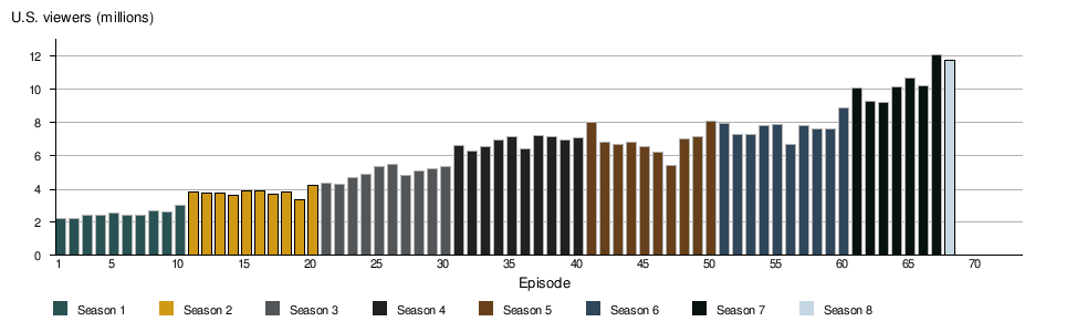 Sau khi lên sóng 7 season từ năm 2011 tới nay, Game of Thrones đã trở thành một hiện tượng màn ảnh nhỏ với lượng khán giả khổng lồ cùng con số giải thưởng cao chót vót. Đặc biệt, độ đầu tư lớn cùng nội dung mạch lạc, không theo motif đóng khuôn như các series khác đã giúp Game of Thrones không ngừng mở rộng lượng khán giả qua từng mùa, thay vì bị giảm như nhiều series truyền hình khác. Mới đây nhất, tập đầu tiên của mùa 8, cũng là mùa cuối cùng của Game of Thrones đã thu về số người xem kỷ lục, cao hơn bất cứ tập nào trước đó.
