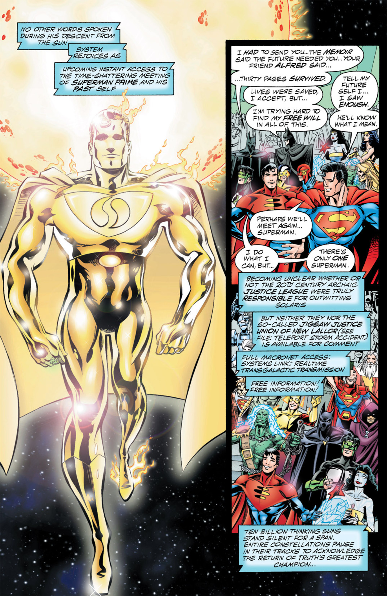 Sau khi bị Green Lantern Kyle Rayner tấn công, Solaris dần trở nên suy yếu, nhưng hắn vẫn rắp tâm làm Mặt Trời bị nhiễm độc. Bỗng nhiên, một bàn tay khổng lồ được tạo bởi nhẫn Green Lantern từ đâu vươn đến Solaris, bóp vụn hắn. "Green Lantern" lạ mặt này thật ra là Superman Prime, nhân vật đã "ngâm" mình trong Mặt Trời hàng thế kỷ nay, cụ thể là 15.000 năm.