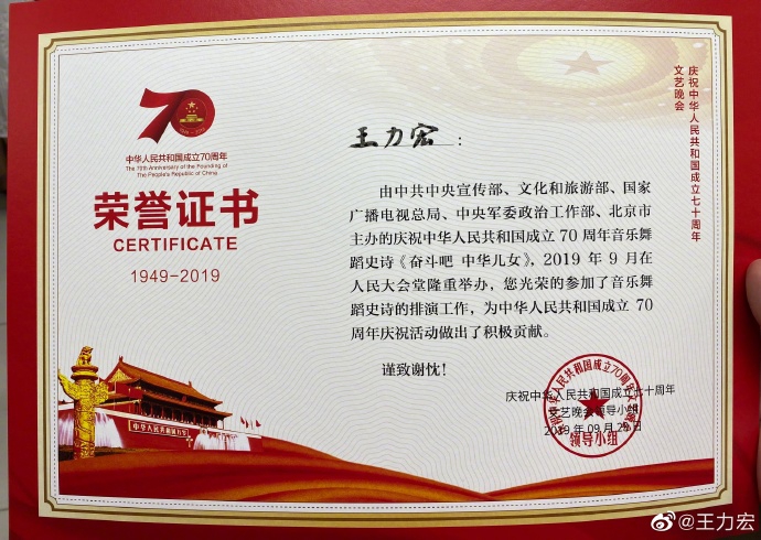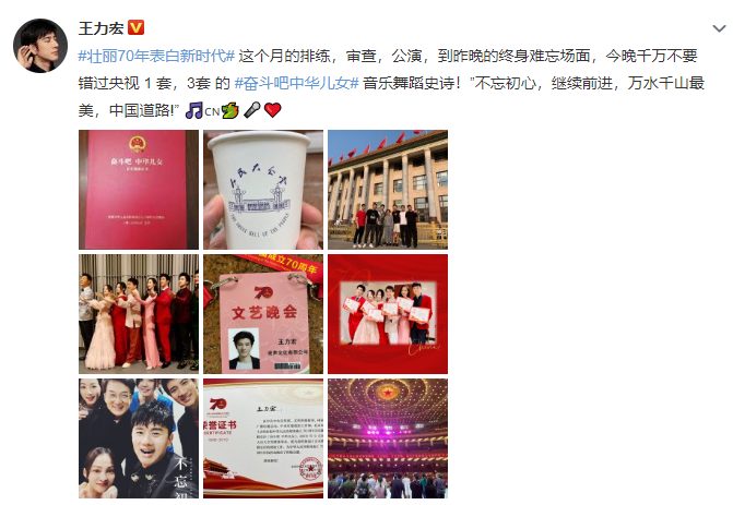 Vương Lực Hoành viết trên Weibo của mình: “Lời bộc bạch 70 năm tuyệt vời của thời đại mới. Việc tập luyện của tháng này, đánh giá, biểu diễn đến những cảnh khó quên của đêm qua, tối nay đừng bỏ lỡ chương trình tối nay. Không quên những gì những gì mình đặt ra lúc đầu, tiếp tục tiến về phía trước, cảnh vật xung quanh rất xinh đẹp”.