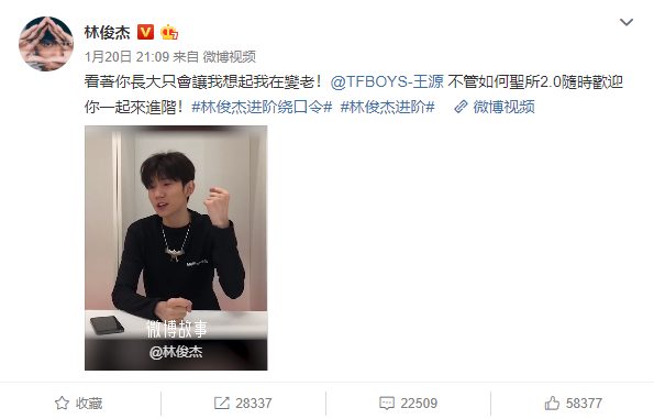 Vào tối ngày 20/01 vừa qua, Lâm Tuấn Kiệt bất ngờ đăng tải một video lên mạng xã hội Weibo. Trong đó, Vương Nguyên của TFBOYS đang thực hiện một thử thách đọc nhanh mà không vấp với thời gian quy định. Nam ca sĩ kèm theo chú thích: “Nhìn em trưởng thành sẽ chỉ nhắc nhở anh rằng anh đang già đi! @TFBOYS- Vương Nguyên. Dù thế nào đi chăng nữa, Thánh địa 2.0, hoan nghênh em tiến lên bất cứ lúc nào”.