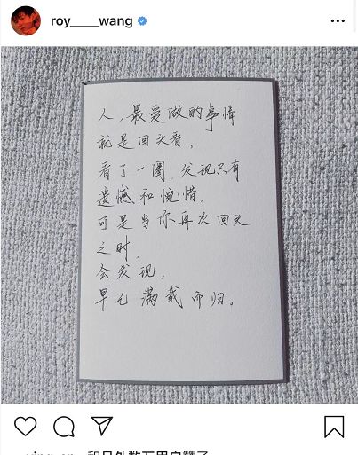 Tiếp theo Vương Nguyên lại đăng thêm một tấm ảnh lời ca vừa mới nghĩ ra: “Em đã viết được bài hát rồi, chủ đề đại khái là như vậy 'Con người việc làm thích nhất chính là quay đầu lại, nhìn qua một lượt chỉ có tiếc nuối và thương tiếc, nhưng khi bạn nhìn lại lần nữa sẽ phát hiện bạn đã gặt được nhiều thành công xứng đáng.'”