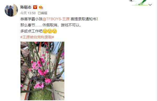 Cũng vào chiều ngày 31 tháng 1, tin tức Vương Nguyên trúng tuyển vào học viên âm nhạc này chính thức được đăng tải lên mạng xã hội nhận được nhiều sự chúc mừng của fan hâm mộ, với việc trúng tuyển lần này cũng đồng nghĩa Vương Nguyên cũng sắp phải rời xa quê hương, rời gia đình để đi du học.