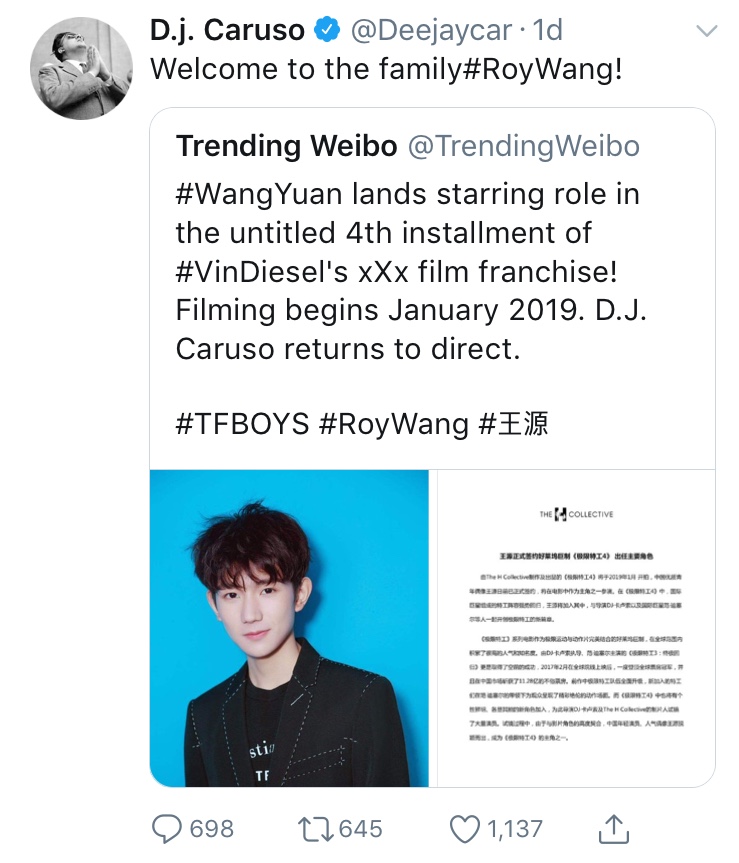 Trước đó một ngày (04/09), đạo diễn người Mỹ tài năng D.J. Caruso của bom tấn đã share bài viết có liên quan đến Vương Nguyên trên Twitter và nói rằng: “Chào mừng đến với gia đình #RoyWang!”.