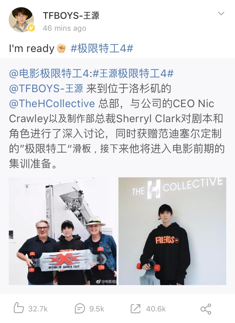 Vào trưa ngày 05/09, nhà sản xuất dự án phim điện ảnh bom tấn xXx: Return of Xander Cage 4 (XXX: Sự trở lại của Xander Cage 4) đã đăng tải thông tin và hình ảnh của chàng ca sĩ điển trai Vương Nguyên trên mạng xã hội kèm theo dòng trạng thái: “Vương Nguyên của nhóm TFBOYS đã đến trụ sở chính của THE H COLLECTIVE đặt tại Los Angeles, Hoa Kỳ. Anh đã tập trung thảo luận về kịch bản cũng như nhân vật mà mình đảm nhận với Giám đốc điều hành của công ty là Nic Crawley và chủ tịch bộ phận sản xuất Sherryl Clark”.