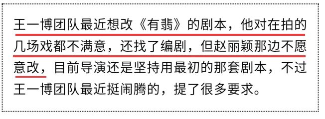 Tối qua (05.12), trên mạng xuất hiện tin đồn Vương Nhất Bác tỏ ra không hài lòng với nội dung Hữu phỉ, thế nên đã yêu cầu chỉnh sửa lại kịch bản. Nam diễn viên tìm biên kịch riêng mang đến đoàn phim nhưng lại bị nữ chính Triệu Lệ Dĩnh và đạo diễn bộ phim bác bỏ, cự tuyệt. Đạo diễn nhất quyết dùng kịch bản ban đầu đã định. Ngoài ra, bên phía Vương Nhất Bác liên tục đưa ra rất nhiều yêu cầu trong thời gian gần đây!