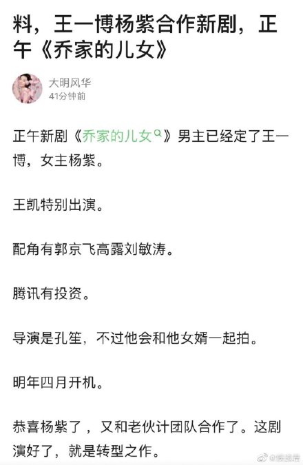 Mới đây, trên mạng xuất hiện tin Con gái nhà họ Kiều sẽ giao cho Dương Tử và Vương Nhất Bác đảm nhận vai chính. Cả hai đều là những tiểu sinh, tiểu hoa vô cùng được yêu thích hiện nay. Nếu họ thật sự hợp tác với nhau, tin chắc rằng tác phẩm sẽ trở nên vô cùng hot. Cách đây không lâu, Dương Tử vừa “kết đôi” với Tiêu Chiến, lần này lại có thể “nên duyên” với Vương Nhất Bác. Điều này sẽ tạo ra rất nhiều chủ đề để cư dân mạng đem ra thảo luận.