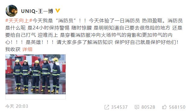 Tối ngày 22/10, Vương Nhất Bác đăng tải hình ảnh làm cứu hỏa trong Thiên thiên hướng thượng và anh chàng đã có cơ hội được trải nghiệm thực tế công việc này. Vương Nhất Bác chia sẻ hình ảnh với nội dung: “Hôm nay tôi là 'nhân viên cứu hỏa'. Hôm nay được trải nghiệm một ngày làm lính cứu hỏa, tôi đã rơi nước mắt trước những gì họ đã làm. Nhân viên cứu hỏa là gì?”