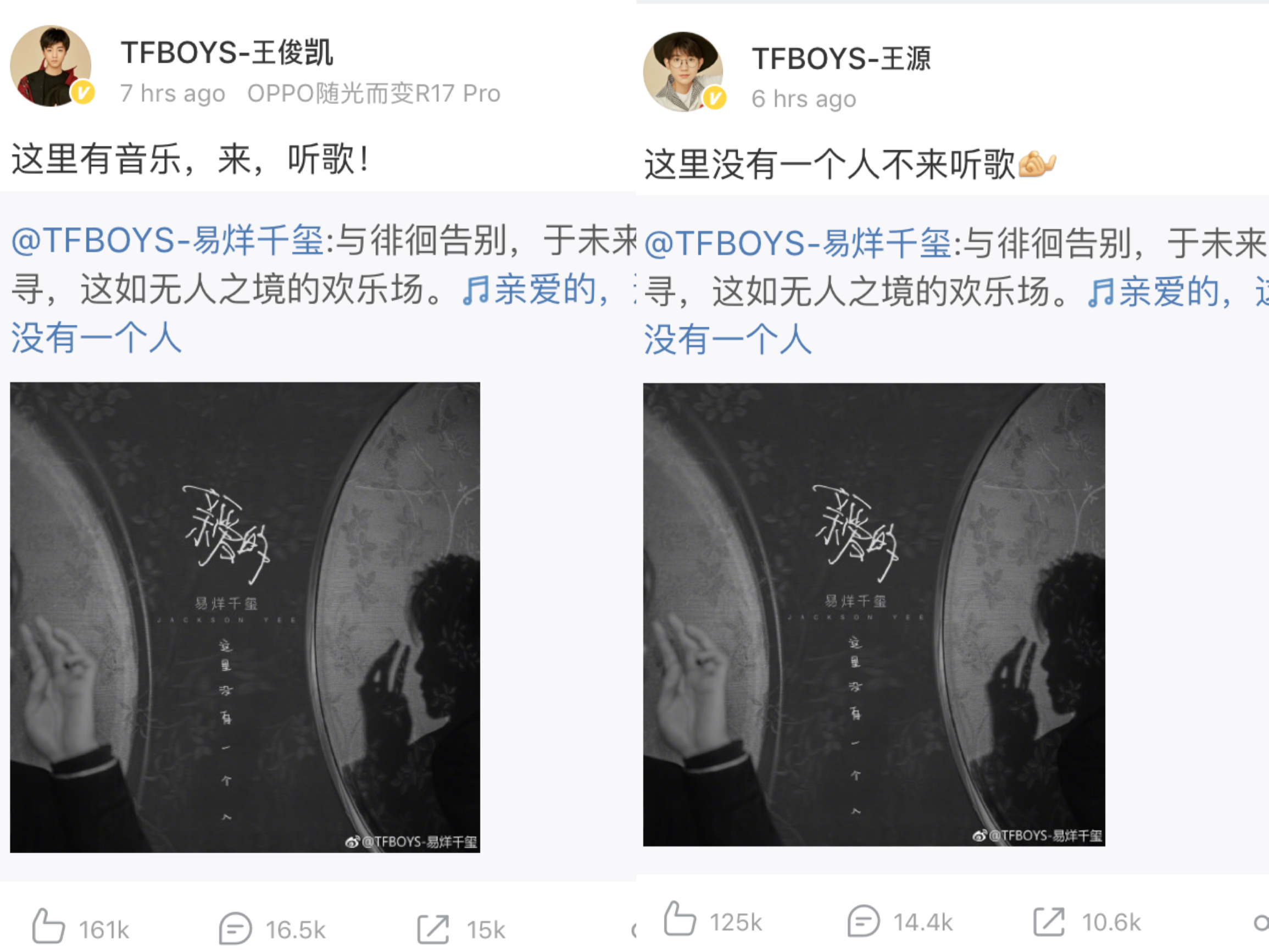 Đặc biệt và thú vị hơn khi hai thành viên còn lại của TFBOYS, Vương Tuấn Khải và Vương Nguyên đã chia sẻ, ủng hộ sản phẩm mới cũng như con đường sự nghiệp solo của Thiên Tỉ. Tuấn Khải chia sẻ bài viết cùng lời nhắn: “Nơi này có âm nhạc, đến, nghe ca khúc mới nào!”. Vương Nguyên nói: “Ở đây không ai không tới nghe bài hát cả”.
