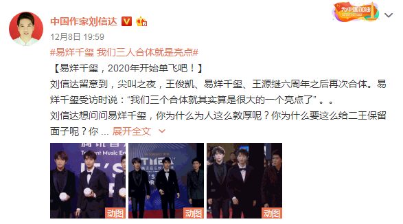 Sau khi nhìn thấy Dịch Dương Thiên Tỉ lên hot-search, Lưu Tín Đạt - Tác giả Trung Quốc nổi tiếng đã đăng tải một bài viết trên weibo của mình: “Dịch Dương Thiên Tỉ, năm 2020 nên hoạt động một mình đi! Lưu Tín Đạt - tôi đây xin hỏi Dịch Dương Thiên Tỉ một chút: Tại sao cậu lại chất phát như vậy chứ? Tại sao cậu phải giữ lại mặt mũi cho “nhị vương” chứ? Cậu không biết Vương Tuấn Khải đã hết thời rồi sao? Cậu không biết Vương Nguyên vì chuyện hút thuốc đã không còn phim đóng rồi sao? Cậu không biết khi ba người xuất hiện cùng nhau thì hai người kia đang mượn ánh sáng của cậu sao? Lưu Tín Đại hy vọng Dịch Dương Thiên Tỉ năm 2020 hoạt động độc lập, đừng để cho “nhị vương” liên lụy thêm nữa”.