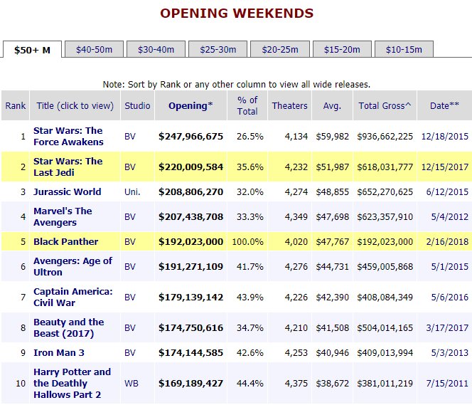 Điều mà khán giả mong ngóng những ngày qua cũng đã đến, khi số liệu doanh thu của Black Panther được công bố. Không nằm ngoài dự đoán, bộ phim thứ 18 của hãng Marvel đã mang về con số kỷ lục với 192 triệu USD chỉ trong 3 ngày đầu công chiếu (16-18/02/2018). Với 4,020 cụm rạp trình chiếu trên toàn nước Mỹ, trung bình mỗi phòng chiếu thu được 47.767 USD.