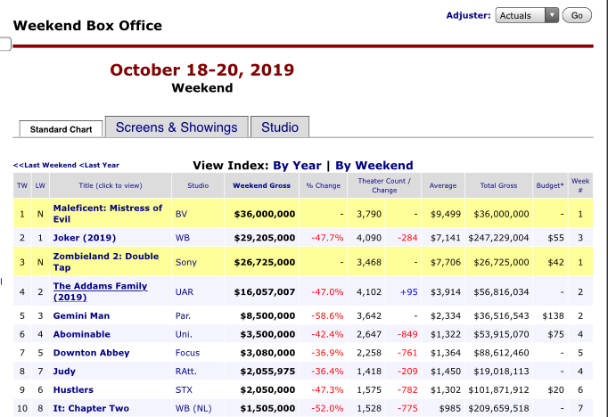 Mới đây, khán giả đã bất ngờ khi Maleficent: Mistress of Evil chỉ mang về 35 triệu USD tại thị trường Bắc Mỹ - thấp hơn đáng kể so với dự báo, ước tính ban đầu. Thế nhưng, bộ phim này vẫn chấm dứt được chuỗi chiến thắng của Joker tại bảng xếp hạng doanh thu Bắc Mỹ.