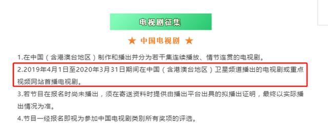 Từ ngày 1/4/2019 đến 31/3/2020, các phim truyền hình được phát sóng trên các đài truyền hình hay trên mạng (bao gồm Hong Kong, Macau, Đài Loan) đều có thể tham gia ứng tuyển để đoạt giải thưởng Bạch Ngọc Lan.