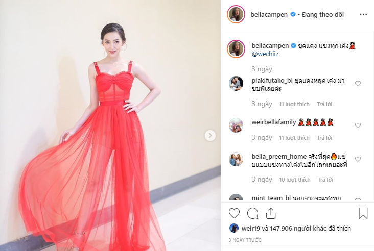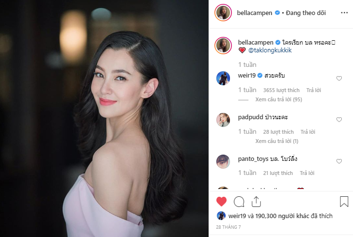 Đặc biệt, tài khoản chính thức của Weir Sukollawat trên mạng xã hội Instagram có tên “weir19” thường xuyên và hầu như luôn “thả tim” cho hầu hết bức ảnh mà Bella chia sẻ. Đôi khi anh chàng còn để lại comment (bình luận) trêu chọc bạn gái.