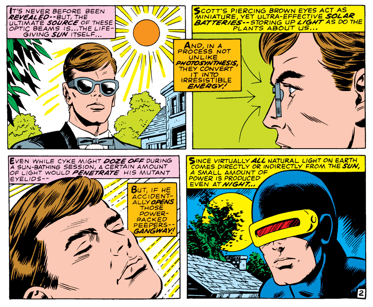 Tuy nhiên, khả năng hấp thụ năng lượng mặt trời có vẻ hơi…phổ thông, nên trong The Official Handbook Of The Marvel Universe #3 vào năm 1983 có đề cập rằng tia Optic là chùm tia năng lượng đến từ 1 chiều không gian khác - 1 vũ trụ non-Einsteinian, nơi mà mọi định luật vật lý của chúng ta trở nên vô nghĩa. Vũ trụ này chứa đầy các hạt giống với hạt photon (quang tử).