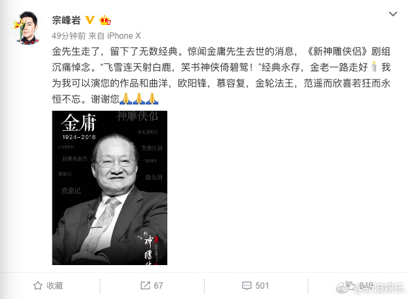 Tống Phong Nham: “Kim tiên sinh đi rồi đã để lại cho đời vô số tác phẩm kinh điển. Khi nghe tin Kim tiên sinh đã qua đời, đoàn làm phim Tân Thần điêu đại hiệp vô cùng đau khổ tưởng niệm. “Phi tuyết liên thiên xạ bạch lộc, tiếu thi thần hiệp ỷ bích uyên”. Kinh điển trường tồn. Kim tiên sinh lên đường bình an…”