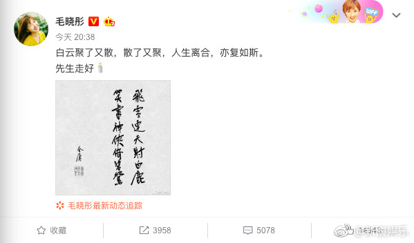 Mao Hiểu Đồng: “Mây trắng tụ rồi lại tan, tan rồi lại tụ, nhân sinh ly hợp, diệc phục như tư. Tiên sinh lên đường bình an”.