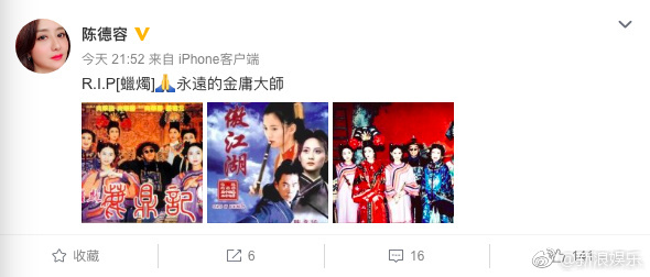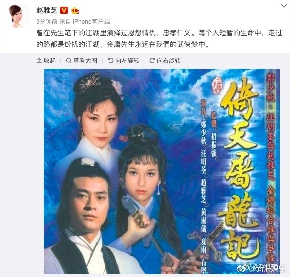 Triệu Nhã Chi: “Từng diễn qua vai diễn ân oán tình thù, trung hiếu nhân nghĩa trong “Giang hồ” dưới ngòi bút của Ông. Trong mỗi một sinh mệnh ngắn ngủi những đoạn đường đi qua đều là những sự phức tạp trong “Giang hồ”. Kim Dung tiên sinh mãi mãi ở trong giấc mộng nghĩa hiệp của chúng tôi”.