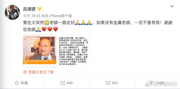 Lữ Tụng Hiền: “Mọi chuyện giờ đây quá đột ngột rồi. Lão sư lên đường bình an. Nếu như không có Kim Dung lão sư nhất định đã không có tôi! Cảm ơn Người, lão sư”.