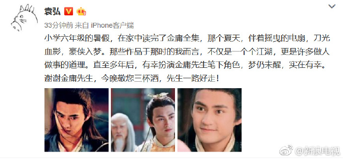 Viên Hoằng: “Kỳ nghỉ hè của những năm tiểu học luôn ở trong nhà đọc hết những tập của Kim Dung…. Không chỉ đơn giản là giang hồ mà còn là những đạo lý làm người. Mãi đến nhiều năm sau mới có vinh hạnh được đảm nhận một vai diễn trong tác phẩm của Kim Dung, mộng vẫn chưa tỉnh, thực tại vinh hạnh. Cảm ơn Kim Dung tiên sinh, tối nay kính Người ba ly, lên đường bình an”.