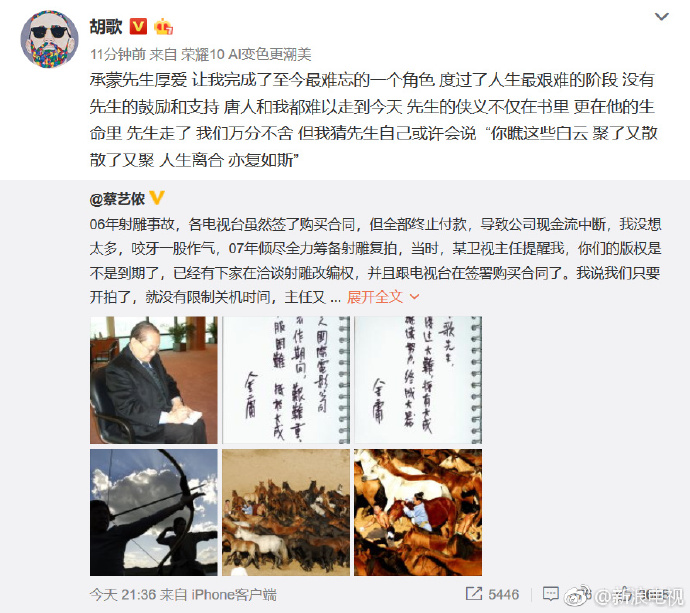 Hồ Ca: “Bởi vì có Kim Dung mới có thể giúp cho bản thân có một vai diễn khó quên đến ngày hôm nay, vượt qua giai đoạn khó khăn nhất trong cuộc đời. Không có sự động viên ủng hộ của Tiên sinh thì bản thân khó có thể đi được đến ngày hôm nay. Hiệp nghĩa của tiên sinh không chỉ có ở trong sách không mà còn có cả trong sinh mệnh của ông ấy. Tiên sinh đi rồi chúng tôi vạn phần không nỡ. Nhưng tôi đoán tiên sinh sẽ nói: 'Mây trắng tụ rồi lại tan, tan rồi lại tụ, nhân sinh ly hợp, diệc phục như tư'”.