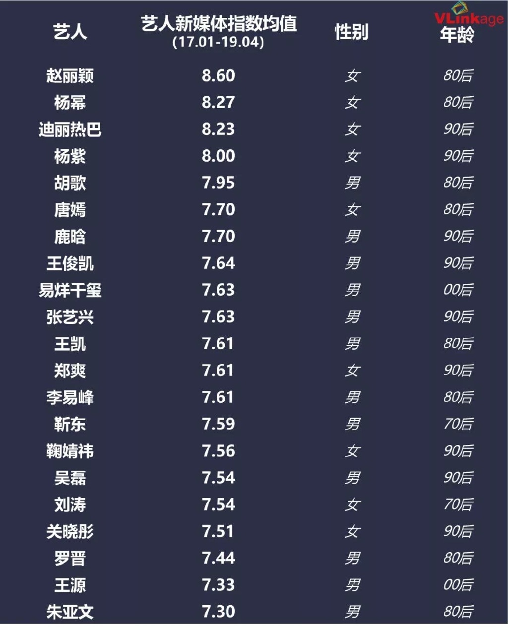 Mới đây, trang Vlinkage đã đưa ra danh sách xếp hạng chỉ số truyền thông 3 năm liên tiếp của các sao Hoa ngữ và Triệu Lệ Dĩnh đã vươn lên dẫn đầu với chỉ số 8.6. Ngoài Triệu Lệ Dĩnh ra, trong danh sách 21 ngôi sao này đều là những cái tên quen thuộc như Dương Mịch, Địch Lệ Nhiệt Ba, Dương Tử, Đường Yên, bộ ba thành viên TFBoys, Trịnh Sảng, Lộc Hàm, Quan Hiểu Đồng, Lý Dịch Phong…
