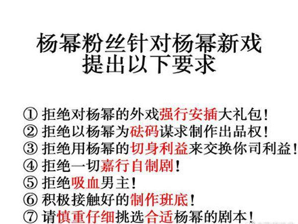 Ngoài ra, fan của Dương Mịch cũng yêu cầu phía công ty phải nghiêm túc tìm kiếm kịch bản tốt cho cô, cũng như nếu muốn tự sản xuất phim thì phải đầu tư vào ekip, đạo diễn lớn thay vì làm những tác phẩm mì ăn liền.
