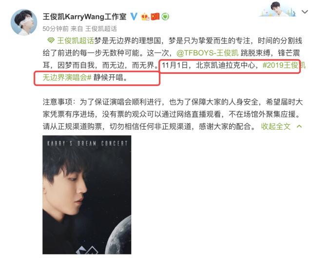 Buổi liveshow cá nhân đầu tiên của Vương Tuấn Khải được rất nhiều người trông chờ, cuối cùng đã thành hiện thực. Phòng làm việc của Vương Tuấn Khải đăng tải tin: “Ngày 1/11, Cadillac Arena, live show vô biên giới của Vương Tuấn Khải vào năm 2019 sẽ được diễn ra”.