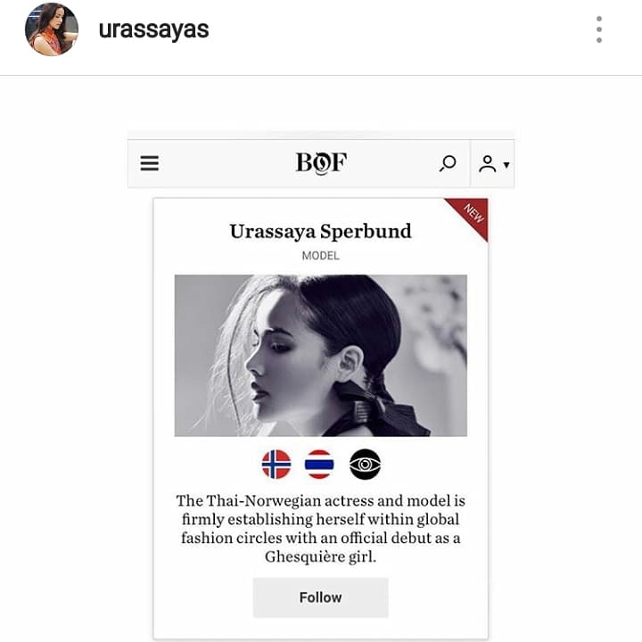 Với vai trò là diễn viên, người mẫu ảnh từng xuất hiện trên các tạp chí thời trang lớn như Vogue, Elle, Seventeen, Harper’s Bazaar và Cosmopolitan, Yaya Urassaya vinh dự được có tên trong danh sách cao quý này. Bên cạnh đó, Yaya cũng là người Thái đầu tiên xuất hiện trên US Vogue. Cùng với Yaya còn có 3 đại diện đến từ Thái Lan cũng góp mặt trong BoF 500 2018.