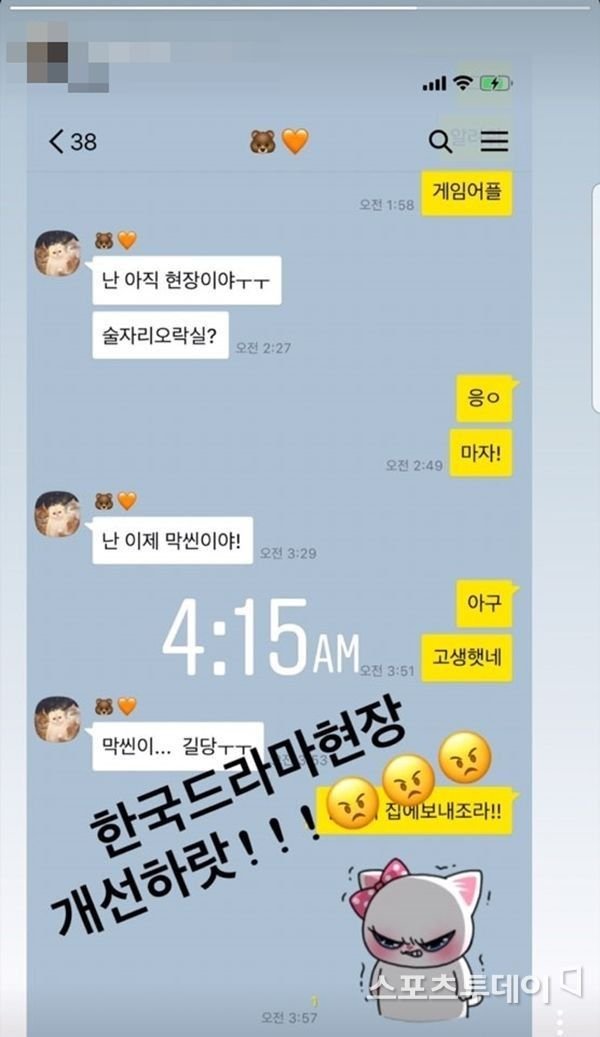 Cô nữ sinh cũng đăng một bức ảnh chụp màn hình cuộc trò chuyện trên KakaoTalk với Yoon Kyun Sang. Bức ảnh đại diện là thú cưng của anh và nội dung nói về việc quay phim trên phim trường. Các bài đăng này đã bị xóa và cô ấy đặt Instagram của mình ở chế độ riêng tư.