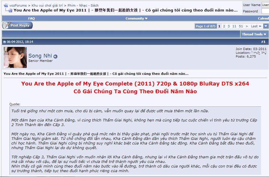 Điển hình là topic You Are the Apple Of My Eye 2011 | - 那些年我们一起追的女孩 | - Cô gái chúng tôi cùng theo đuổi năm nào… trên diễn đàn VOZ do thành viên Song Nhi khởi xướng và cung cấp bản dịch cũng như các clip hậu trường thú vị, thông tin bên lề xoay quanh bộ phim vẫn luôn có người vào bình luận mới và chia sẻ cảm nhận về bộ phim xuyên suốt từ ngày mở topic 6/4/2012 cho tới tận ngày 13/10/2018, topic. Topic hiện nay đã kéo dài tới 875 trang và có vẻ vẫn chưa có dấu hiệu “nguội” chút nào.