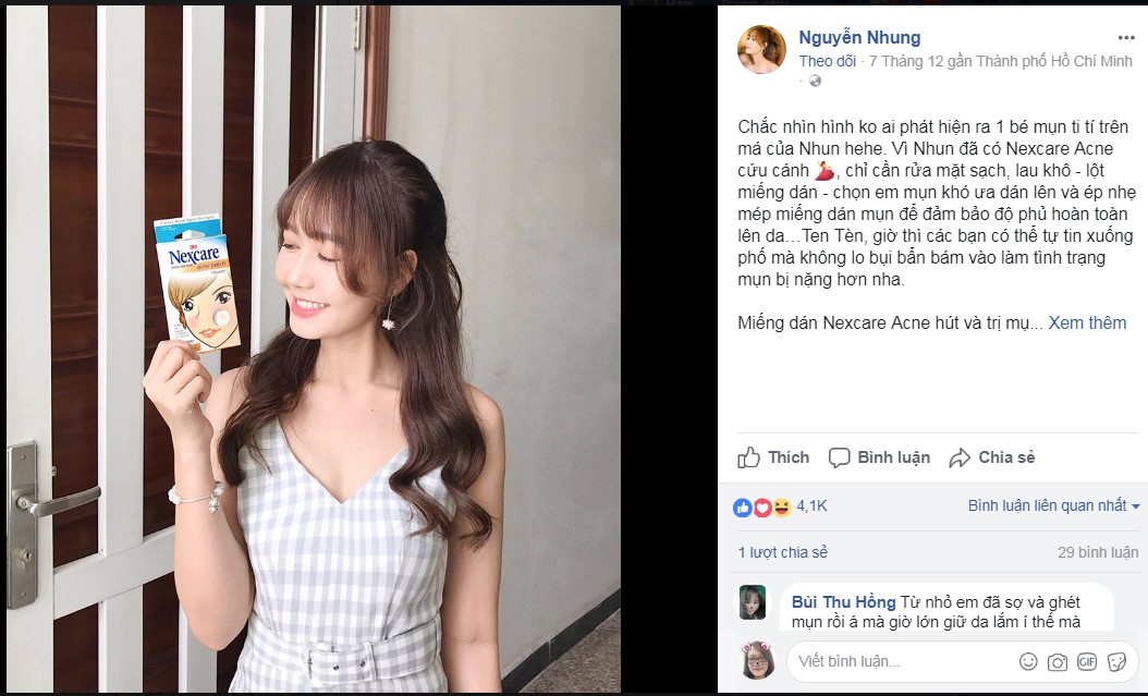 Nhung Gumiho chia sẻ Nexcare là cứu cánh của cô mỗi khi mụn xuất hiện: “Chỉ cần rửa mặt sạch, và lau khô - tách một miếng dán mụn từ lớp film nhựa và dán lên mụn để hấp thụ mủ - chọn em mụn khó ưa ép nhẹ mép miếng dán mụn đảm bảo phủ hoàn toàn lên da là có thể tự tin xuống phố mà không lo bụi bẩn bám vào làm tình trạng mụn bị nặng hơn”. Cô nàng cũng đã chia sẻ bí quyết này ngay trên trang cá nhân của mình và được hưởng ứng với lượt like khủng.