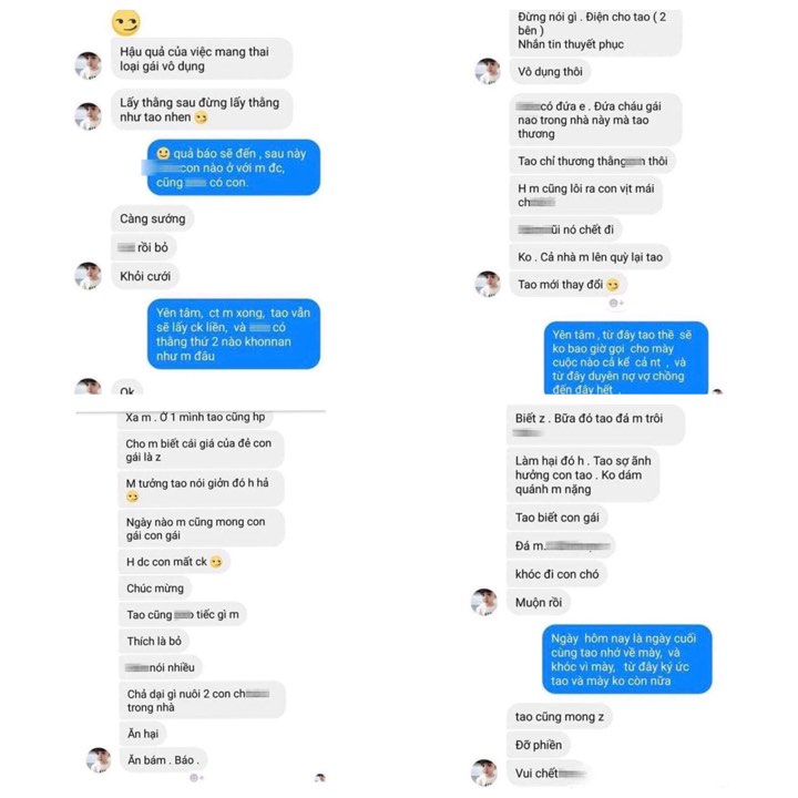 Trong đoạn trò chuyện mà người vợ đăng tải, tài khoản được cho là của người chồng liên tiếp gửi đến những dòng tin nhắn tràn ngập lời chửi bới. ‘Cho mày biết cái giá của đẻ con gái là vậy. Mày tưởng tao giỡn hả? Ngày nào mày cũng mong con gái, bây giờ được con mất chồng, chúc mừng', 'hậu quả của việc mang thai loại con gái vô dụng', 'tao chỉ thương thằng thôi, giờ mày lại lôi ra một con vịt mái' - tin nhắn đoạn chat của người chồng được vợ chụp lại và đăng tải trên mạng xã hội.