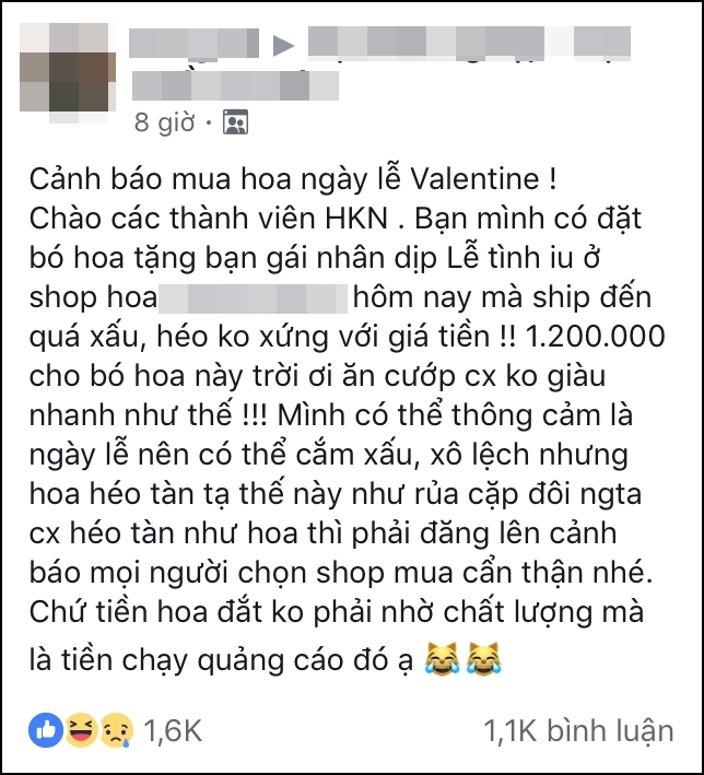 Chuyện là anh chàng này muốn mua một đóa hoa hồng cho bạn gái nên ngày 12/2 anh đã đặt ở shop nổi tiếng tên X. một bó hoa với giá 1 triệu 2 cộng phí ship 60 nghìn đồng. Tuy nhiên, đến ngày 13/2 anh chàng tá hỏa khi nhận về thành quả bó hoa vừa héo vừa xấu không xứng với giá tiền khiến anh rất bực mình.