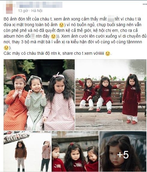 “Bộ ảnh đón Tết của cháu mình, xem ảnh xong cảm thấy mất Tết vì cháu mình là đứa xị mặt trong toàn bộ ảnh“, nickname N.V.T.L viết chú thích khi đăng bộ ảnh lên trang.