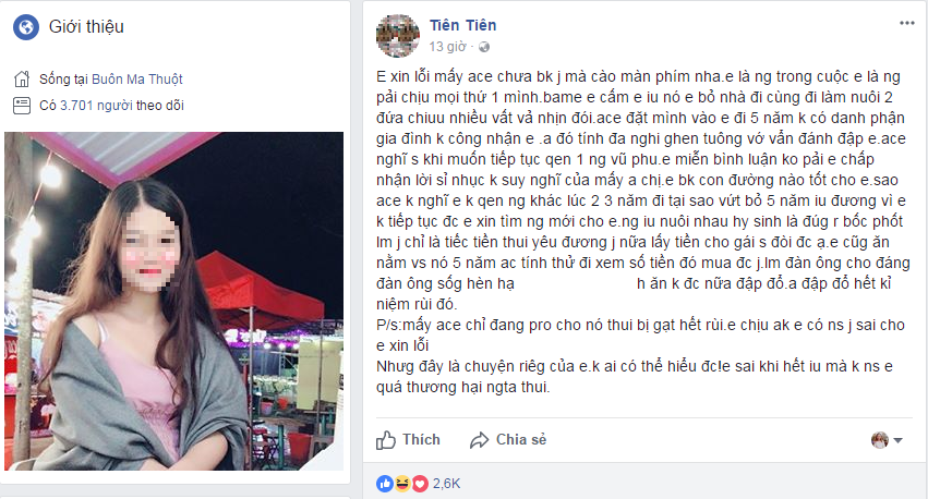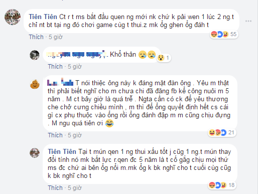 “Em xin lỗi mấy anh/chị/em chưa biết gì mà cào bàn phím. Em là người trong cuộc, em là người phải chịu mọi thứ 1 mình. Ba mẹ em cấm em iu anh ấy, em bỏ nhà đi theo anh ấy rồi đi làm, 2 đứa cùng chịu nhiều vất vả, nhịn đói. Anh/chị/em đặt mình vào em đi, 5 năm không có danh phận gia đình, không công nhận em. Anh đó tính đa nghi, ghen tuông vớ vẩn, đánh đập em. Anh/chị/em nghĩ sao khi muốn tiếp tục quen một người vũ phu.