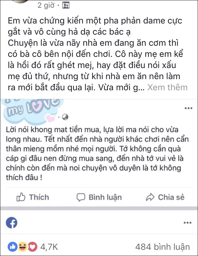 “Chuyện là vừa nãy nhà em đang ăn cơm thì có bà cô bên nội đến chơi. Cô này mẹ em kể là hồi đó rất ghét mẹ, hay đặt điều nói xấu mẹ đủ thứ, nhưng từ khi nhà em ăn nên làm ra mới bắt đầu qua lại. Vừa mới gặp em cô đã tuôn một tràng: