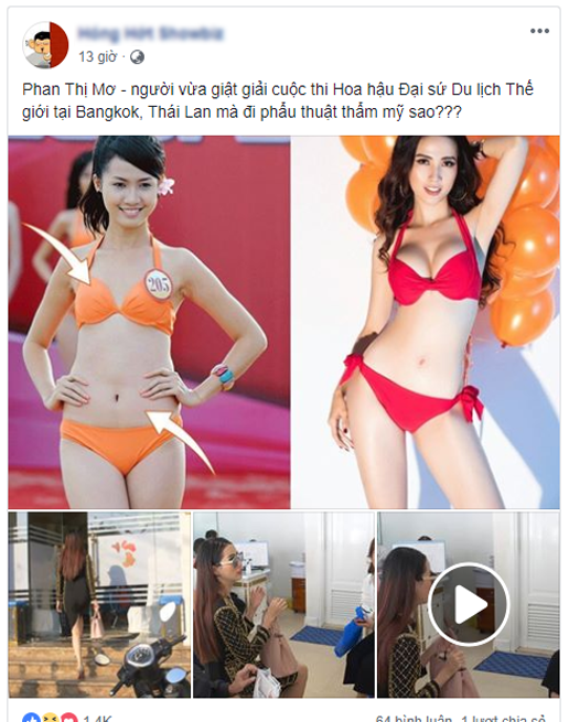1 tháng sau đăng quang với dày đặc những lịch trình của họp báo, đi từ thiện, gặp gỡ giao lưu… Thế nhưng, tối ngày 18/09 hàng loạt fanpage có tiếng đã đăng tải hình ảnh được cho là Phan Thị Mơ kèm nghi án phẫu thuật thẩm mỹ. Chuyện sẽ chẳng có gì lớn nếu sau đó cư dân mạng không tài tình tìm ra hình ảnh cũ với ngoại hình “hơi” khác lạ của Phan Thị Mơ và lan truyền nó rộng rãi trên mạng xã hội.