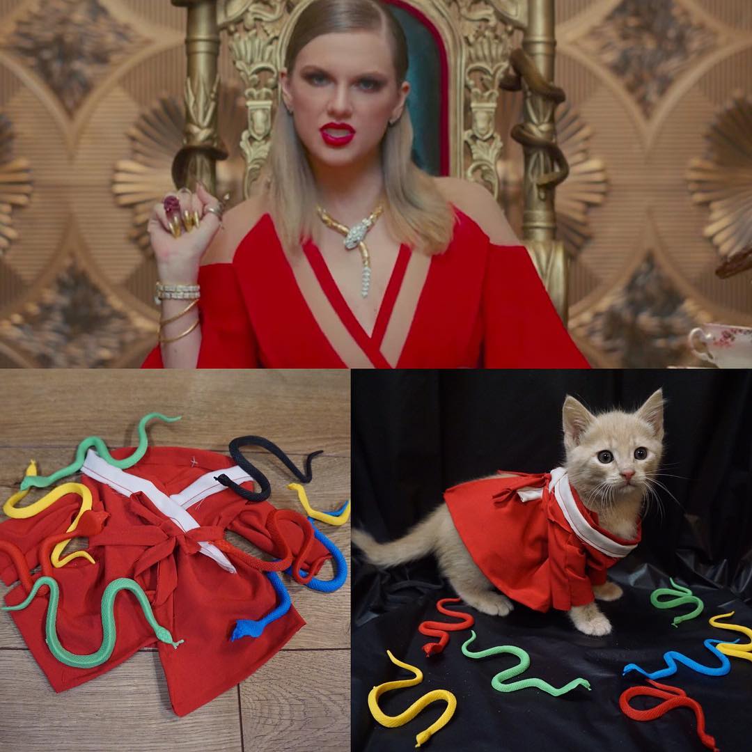 Nếu đã từng mê đắm mẫu váy đắp tà gợi cảm với điểm nhấn là phần thắt eo được sử dụng trong phân cảnh trong Look What You Make Me Do đến từ nhà mốt Balmain thì chắc chắn thiết kế “nhái” này của “người mẫu mèo Garbanzo” sẽ khiến bạn bật cười. Bên cạnh đó, độ dễ thương và bắt kịp xu hướng còn đến từ những chú rắn đầy sắc màu.