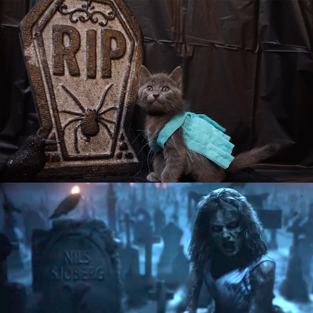 Váy xanh để quay cảnh rùng rợn trong khu rừng tăm tối em cũng có để bắt kịp chị nhé Taylor. Cho phù hợp với bối cảnh hơn thì bưng nguyên một tảng bia RIP để Jelly diễn chung thì hợp quá rồi còn gì!