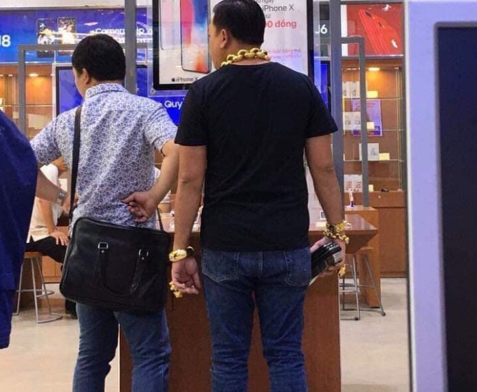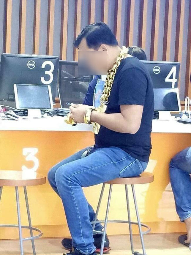 Mới đây, mạng xã hội lan truyền rầm rộ bức ảnh một người đàn ông trên người đeo những dây vàng bản lớn xuất hiện ở một cửa hàng điện thoại.