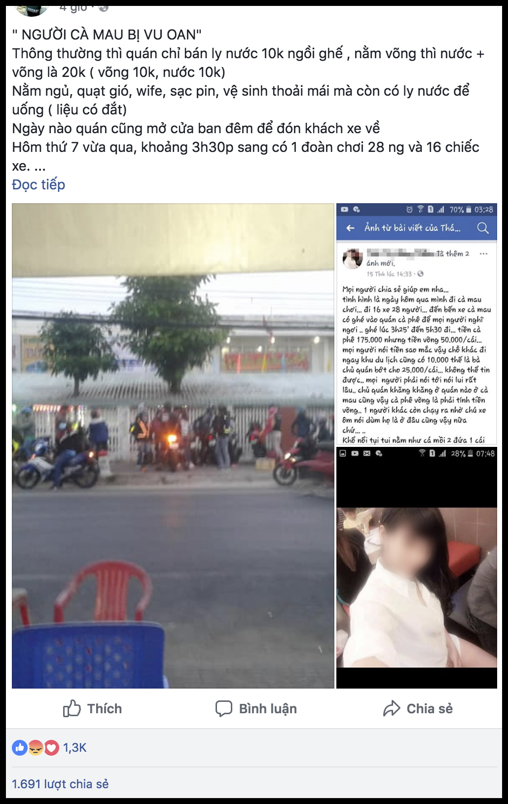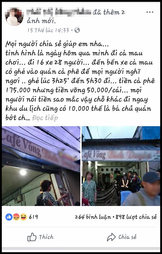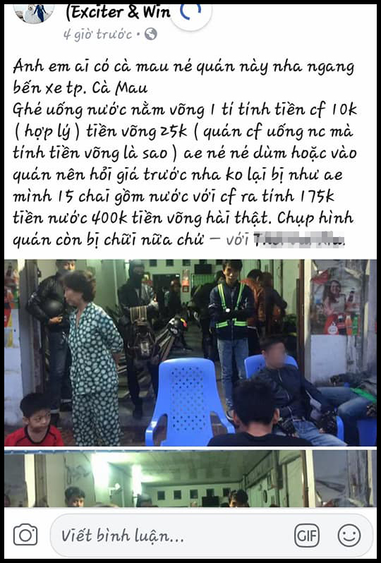 Bài đăng được bắt đầu từ trang cá nhân của một thành viên của đội phượt có tên H.T. Cô gái này cho biết, đoàn phượt 16 xe 28 người có ghé vào một quán cafe ở bến xe Cà Mau vào lúc 3h25 phút, ở lại qua đêm, rời đi vào 5g30 sáng hôm sau. Cả đoàn uống nước hết 175k, tiền võng 50k 1 cái, sau đó được bớt xuống 25k 1 cái. Tổng cộng hơn 400k.