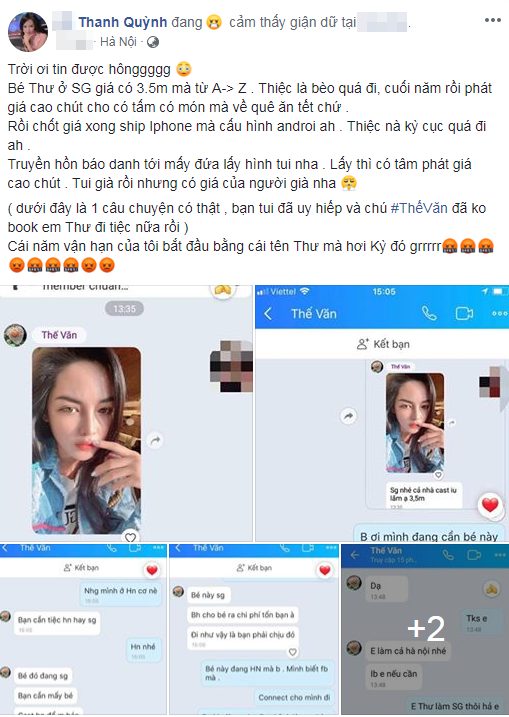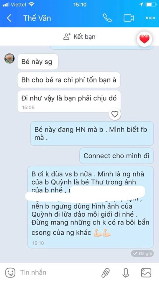 Rất may cho cô, bạn bè của cô đã phát hiện được sự việc và cảnh cáo đe dọa người mối lái: “Bé Thư trong ảnh là Quỳnh và đề nghị bạn dùng hình ảnh Quỳnh để đi môi giới lừa đảo đi nhé!”. Ngay lập tức, người môi giới này hủy kết bạn và lặn mất tăm.