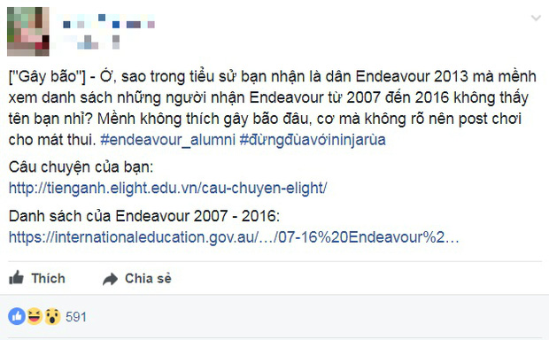 “Mình cũng không rõ bằng ảo hay không ảo. Mình là Endeavour 2014, thường thì những người nhận học bổng Endeavour (cả người Việt lẫn sinh viên quốc tế), network với nhau khá tốt, mà mình không thấy bạn nói trên nên hơi thảng thốt thôi”, L.N bình luận thêm