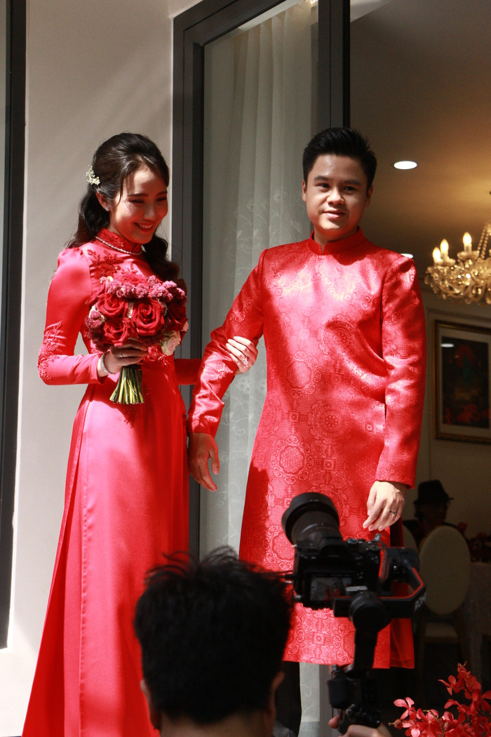 Cặp đôi xuất hiện trong tà áo dài truyền thống, nhan sắc ngọt ngào của cô dâu đã khiến nhiều người "ngất ngây". Trong ngày cưới, Phan Thành và Primmy Trương cũng dành cho nhau những cử chỉ tình cảm.