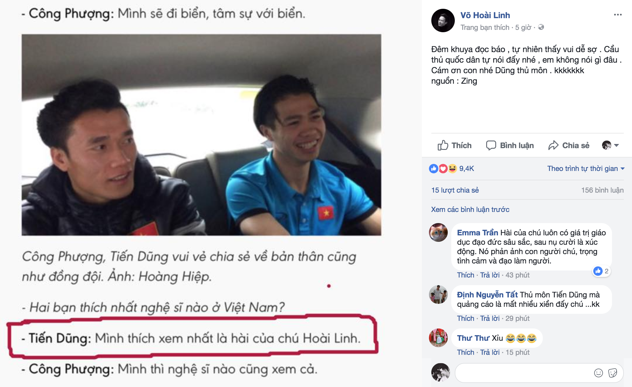 Hoài Linh viết: “Đêm khuya đọc báo, tự nhiên thấy vui dễ sợ”. Không chỉ thế, danh hài còn hóm hỉnh “phân bua” với người hâm mộ: “Cầu thủ quốc dân tự nói đấy nhé, em không nói gì đâu” khiến dân mạng thích thú.