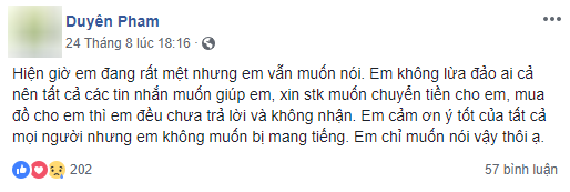 Nhưng sau đó không lâu, tài khoản có tên Duyên Phạm này đã lại thêm đăng đàn thêm một lần để khẳng định đây đúng là Facebook chính chủ, cùng lời giải bày mình chẳng lừa đảo ai cả: “Hiện giờ em đang rất mệt nhưng em vẫn muốn nói.