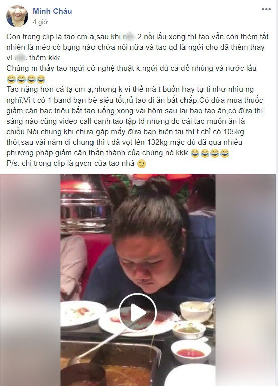 Như câu chuyện của cô nàng Minh Châu (1997, Sài Gòn) dưới đây chẳng hạn. Châu có đăng tải một đoạn clip vui sau khi ăn lẩu no căng rồi nhưng vẫn thèm thuồng mà không dám ăn nữa vì đã nặng tới 132kg rồi. Thế là cô nàng đành phải dùng mũi để thưởng thức khiến nhiều người không khỏi bật cười. Có người trách cô sao không giảm béo, có người buông lời nặng nề và bảo không thể thông cảm nổi. Tuy nhiên, phải sau khi nghe Minh Châu chia sẻ về bản thân mình thì mọi người mới vỡ lẽ và thông cảm cho cô nàng.