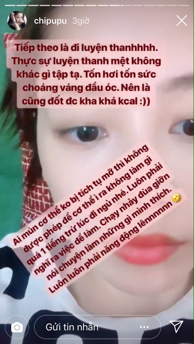 Thế nhưng không có gì là dễ dàng cả. Để có một vóc dáng chuẩn như thế Chi Pu cũng phải bỏ thời gian và công sức luyện tập khá vất vả. Mới đây cô nàng đã chia sẻ một ngày trong chuỗi hành trình giảm 3kg mỡ trong vòng 3 tuần.